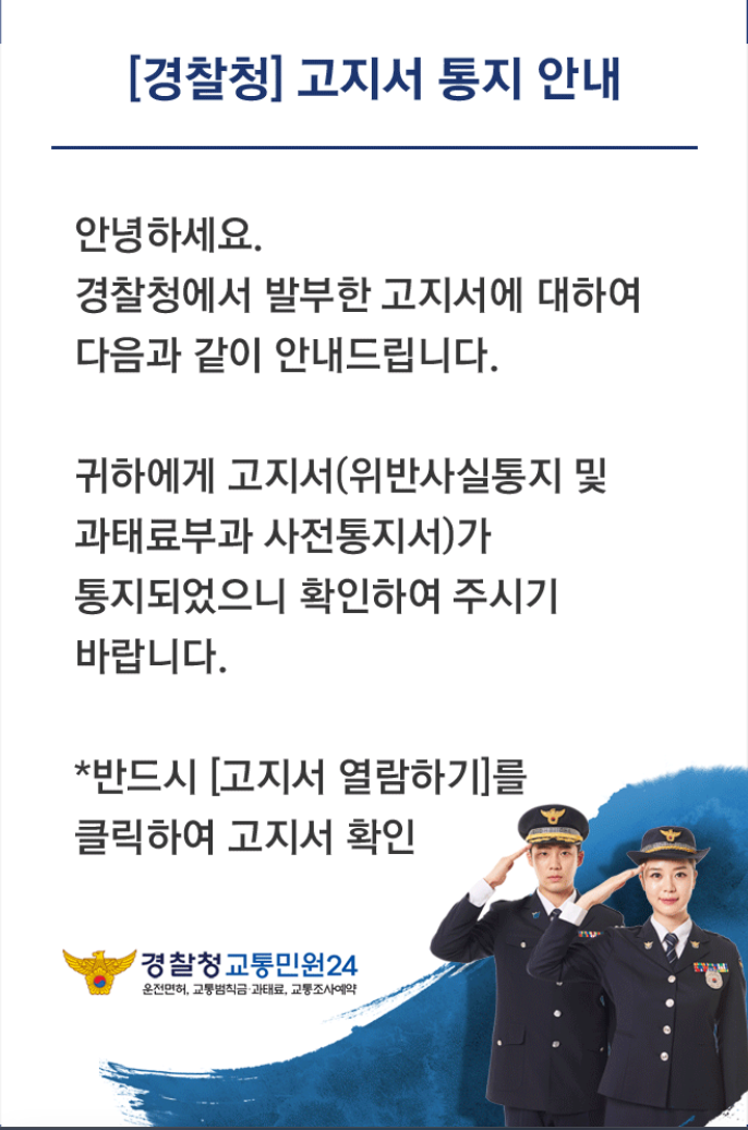 아니요. 경찰청 고지서는 SMS로 오지 않고, 등록한 앱 내에서만 확인 가능합니다.